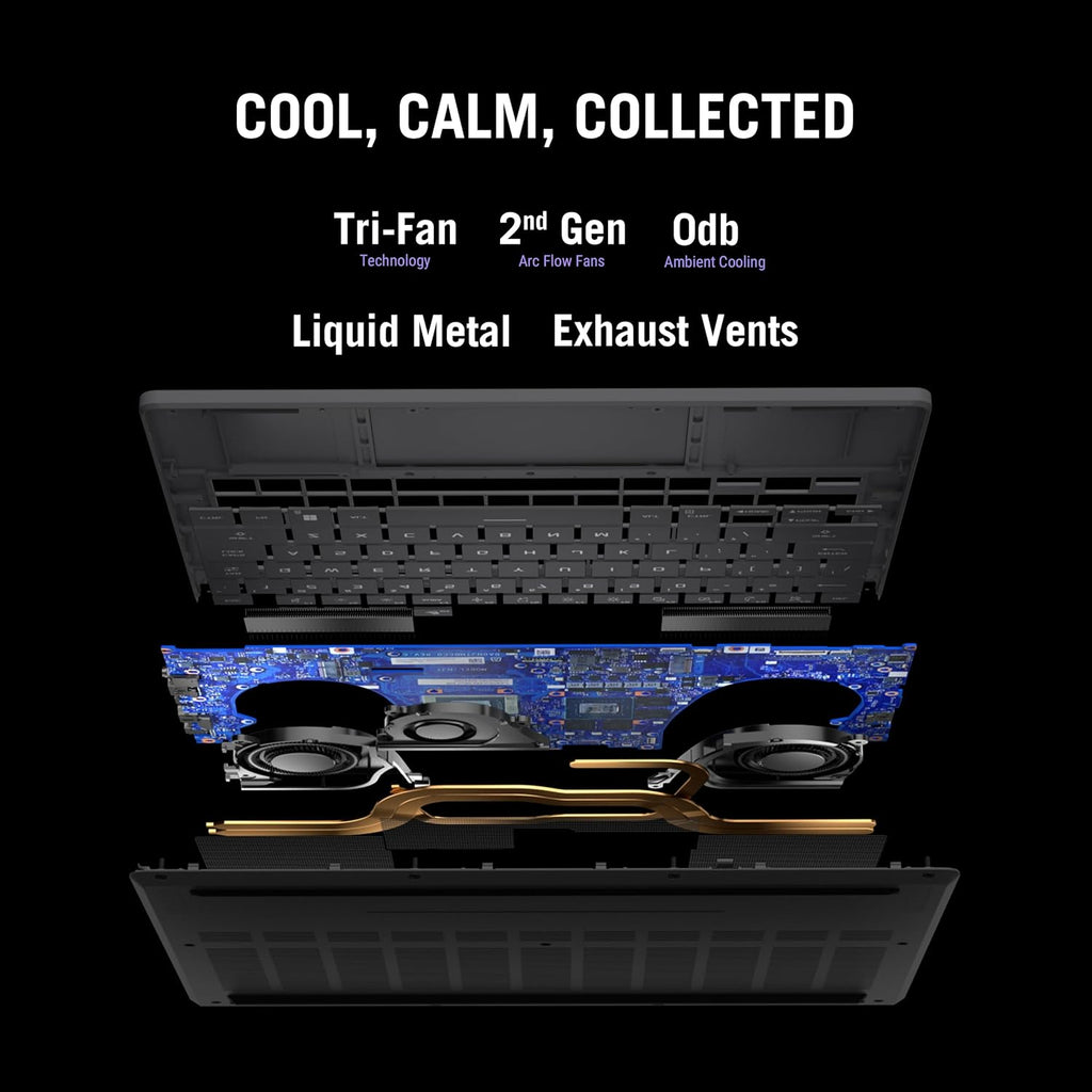 â—† Robust Cooling System: ROG Intelligent Cooling with liquid metal thermal compound and dual Arc Flow Fansâ„¢ ensures optimal thermal performance during intense gaming sessions.