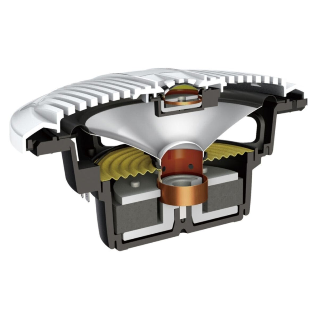 Pioneer ME-series speakers are protected from the effects of sun and water exposure, meeting both IPX7 and ASTM D4329 rated to achieve all-weather reliability. Mica Reinforced IMPP monocoque cone with butyl rubber surround, constructed using an advanced in-mold bonding technique for superior water resistance while maintaining high quality, powerful sound. The symmetrical motor design with high strenth suspension is optimized to provide stability, linearity and clear, low distortion sound reproduction. Lightweight polymide (PI) tweeter diaphragm and uniquely shaped wave guide provides natural and clear vocals with wide dispersion. The TS-ME650FC comes in a classic, contemporary grille that cosmetically integrates seamlessly into marine interiors and cabin designs.
