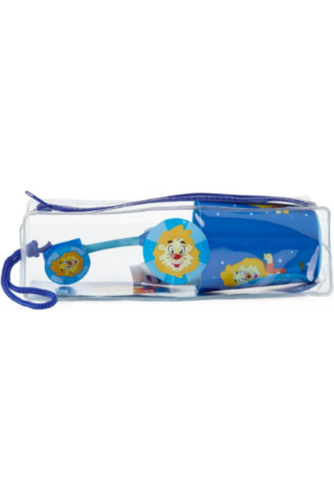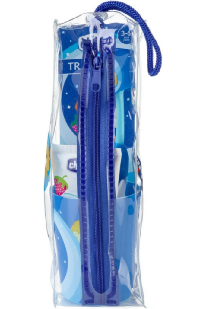 حقيبة سفر عملية. تحتوي على معجون أسنان بنكهة الفراولة، وفرشاة أسنان بشعيرات فائقة النعومة، وكوب شفط وغطاء للشعيرات، وكوب زجاجي ملون للشطف.