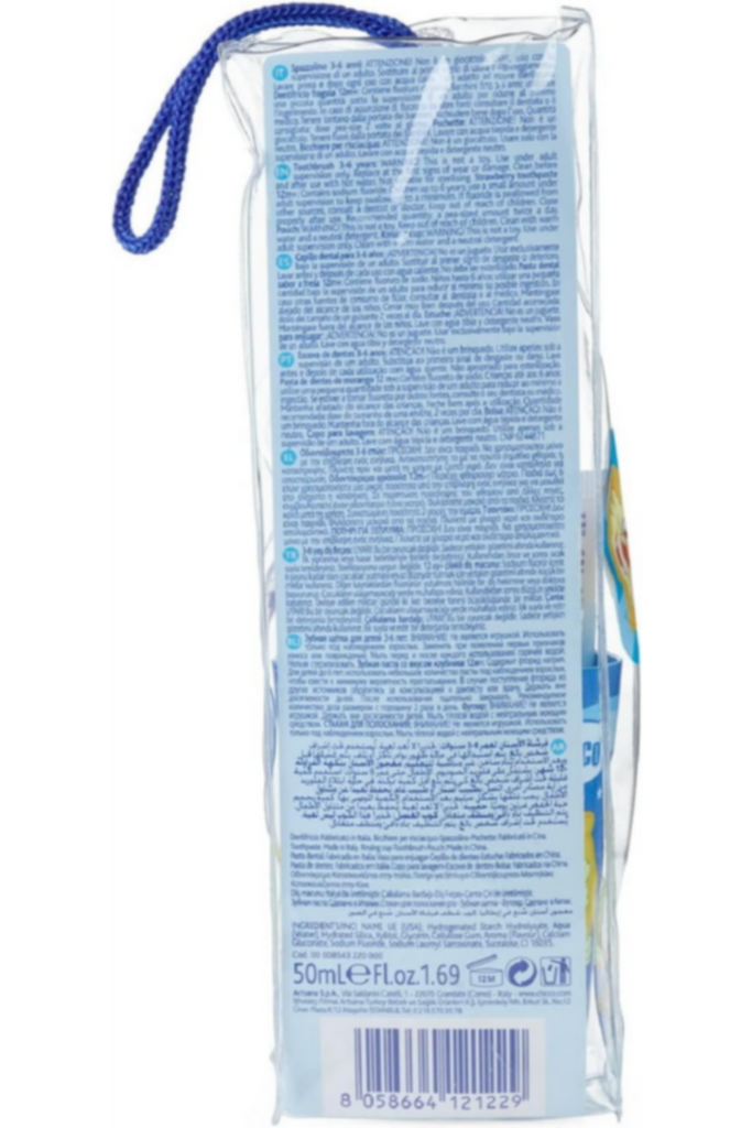 • يحتوي على معجون أسنان بنكهة الفراولة، وفرشاة أسنان بشعيرات فائقة النعومة، وكوب شفط وغطاء للشعيرات، وكوب زجاجي ملون للشطف.