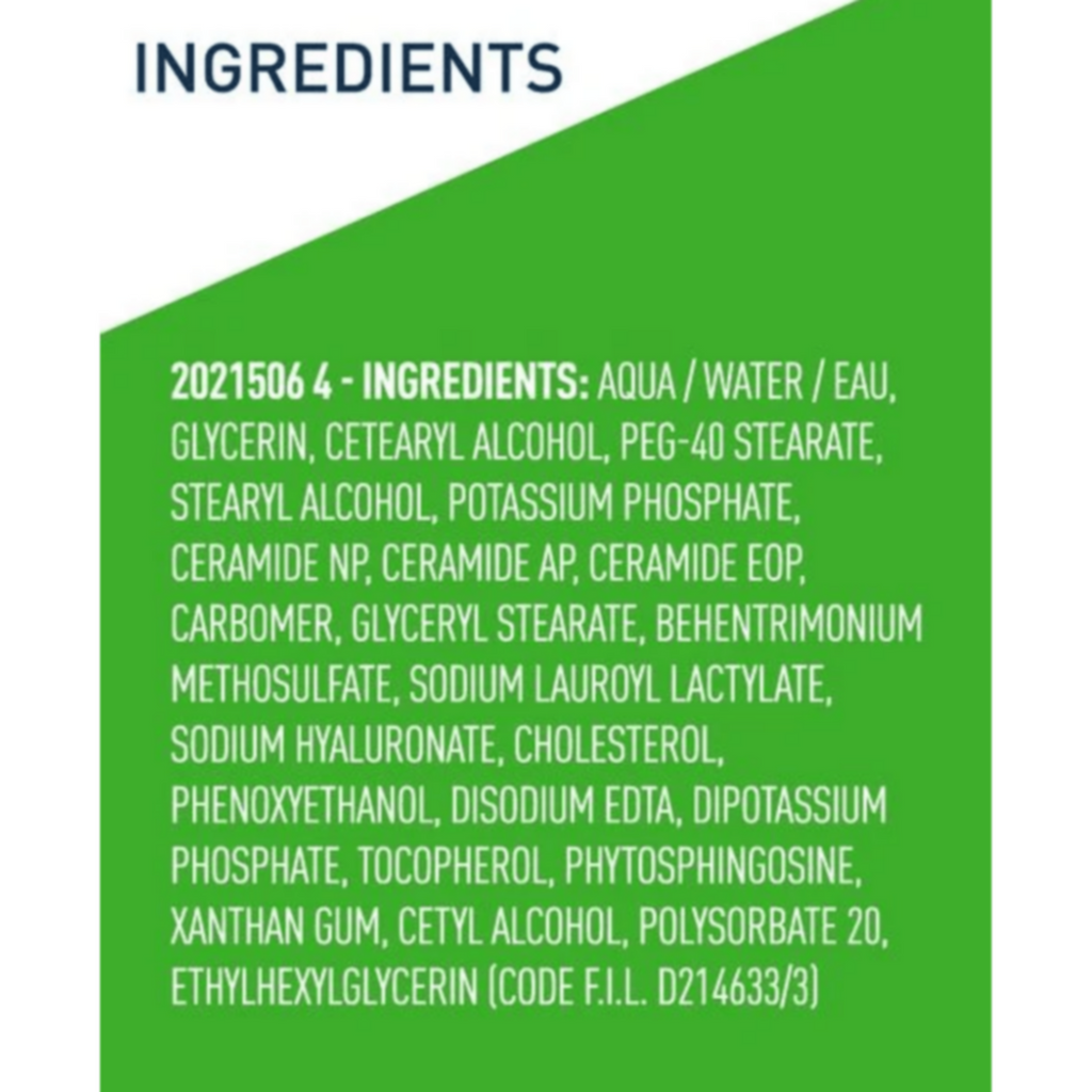 â—† Ingredients: AQUA / WATER / EAU, GLYCERIN, CETEARYL ALCOHOL, PEG-40 STEARATE, STEARYL ALCOHOL, POTASSIUM PHOSPHATE, CERAMIDE NP, CERAMIDE AP, CERAMIDE EOP, CARBOMER, GLYCERYL STEARATE, BEHENTRIMONIUM METHOSULFATE, SODIUM LAUROYL LACTYLATE, SODIUM HYALURONATE, CHOLESTEROL, PHENOXYETHANOL, DISODIUM EDTA, DIPOTASSIUM PHOSPHATE, TOCOPHEROL, PHYTOSPHINGOSINE, XANTHAN GUM, CETYL ALCOHOL, POLYSORBATE 20, ETHYLHEXYLGLYCERIN.