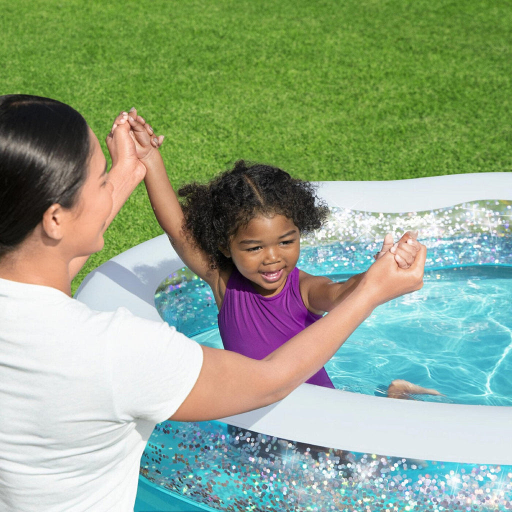 â—† Inflatable pool dimensions of 150 x 127 x 43 cm with glitter design to enchant both girls and boys.