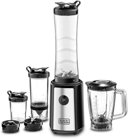 The SBX300BCG-B5 boasts a 300W motor capable of reaching speeds up to 21,500 RPM, ensuring efficient blending and grinding. The 16-piece set includes multiple jars and attachments, such as a 550ml juice cup with citrus attachment, 500ml Tritan sports bottle, 600ml blender jar, and a 300ml grinder mill, providing flexibility for various preparations. Its stainless steel blades are designed to handle ice and frozen fruits, while the turbo speed function offers an extra boost when needed. Additional features like anti-slip feet, dishwasher-safe parts, and sip & seal lids enhance user convenience.