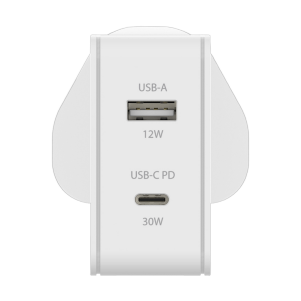 شاحن جداري ثنائي المنافذ، مزود بمنفذي شحن سريع منفصلين: منفذ USB-C بقوة 30 واط بتقنية PD، ومنفذ USB-A بقوة 12 واط. يدعم الشحن السريع بتقنية PD بقوة 30 واط لأجهزة iPhone 14 و13 و12 والإصدارات الأقدم، وiPad Pro، وiPad Air، وأجهزة Android التي تدعم تقنية PD، والكاميرات التي تدعم تقنية PD، وMacBook Air/MacBook Pro. محول جداري صغير الحجم وسهل الحمل، مثالي للاستخدام في المنزل أو المكتب أو أثناء التنقل، للحفاظ على تشغيل جميع أجهزتك. يشحن MacBook/MacBook Air بأقصى سرعة. يشحن MacBook Pro 13 بوصة/16 بوصة بقوة 30 واط (مع العلم أن الشواحن ذات القدرة الأعلى تشحن بشكل أسرع). المدخلات: تيار متردد 100-240 فولت، 50/60 هرتز، 1.2 أمبير. مخرج USB-C (PD 3.0): تيار مستمر 5 فولت 3 أمبير، 9 فولت 3 أمبير، 15 فولت 2 أمبير، 20 فولت 1.5 أمبير (30 واط). مخرج USB-A: تيار مستمر 5 فولت 2.4 أمبير (12 واط). إجمالي الطاقة القصوى 42 واط. مزود بقابس أمريكي مدمج مع محولات قابلة للإزالة للقوابس البريطانية والأوروبية لضمان التوافق مع القوابس البريطانية والأوروبية والأمريكية.