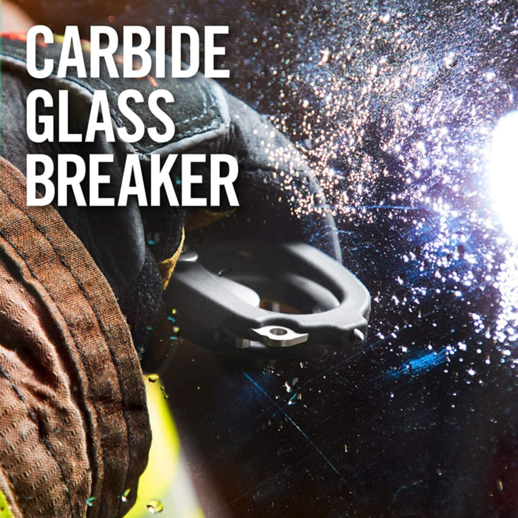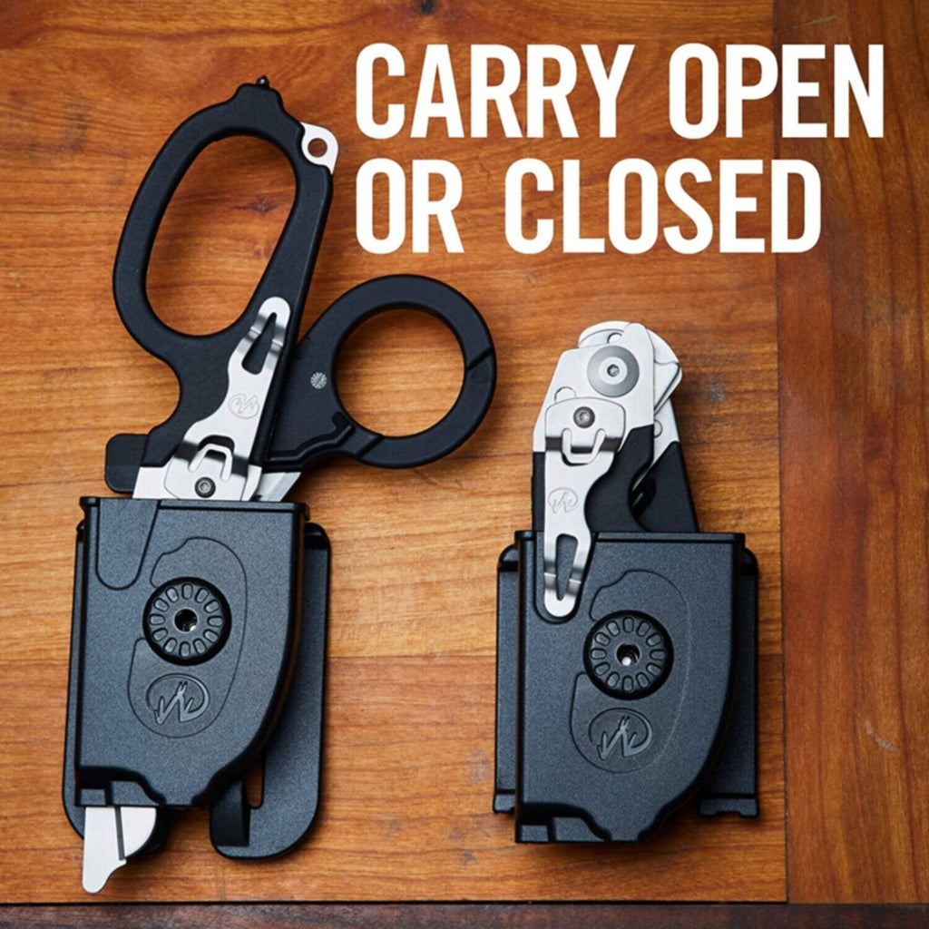 Foldable stainless steel shears with an oxygen tank wrench (U.S. Standard), strap and ring cutters and a carbide glass breaker. Holster included.