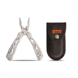 Stainless-steel construction.Supplied with a Clarke branded pouch with belt clip.Filer, long nose pliers, curve jaw pliers.wire cutter, saw, Phillips screwdriver, .standard screwdrivers (1/4", 5/16", 1/8"), small knife, large knife and bottle opener.