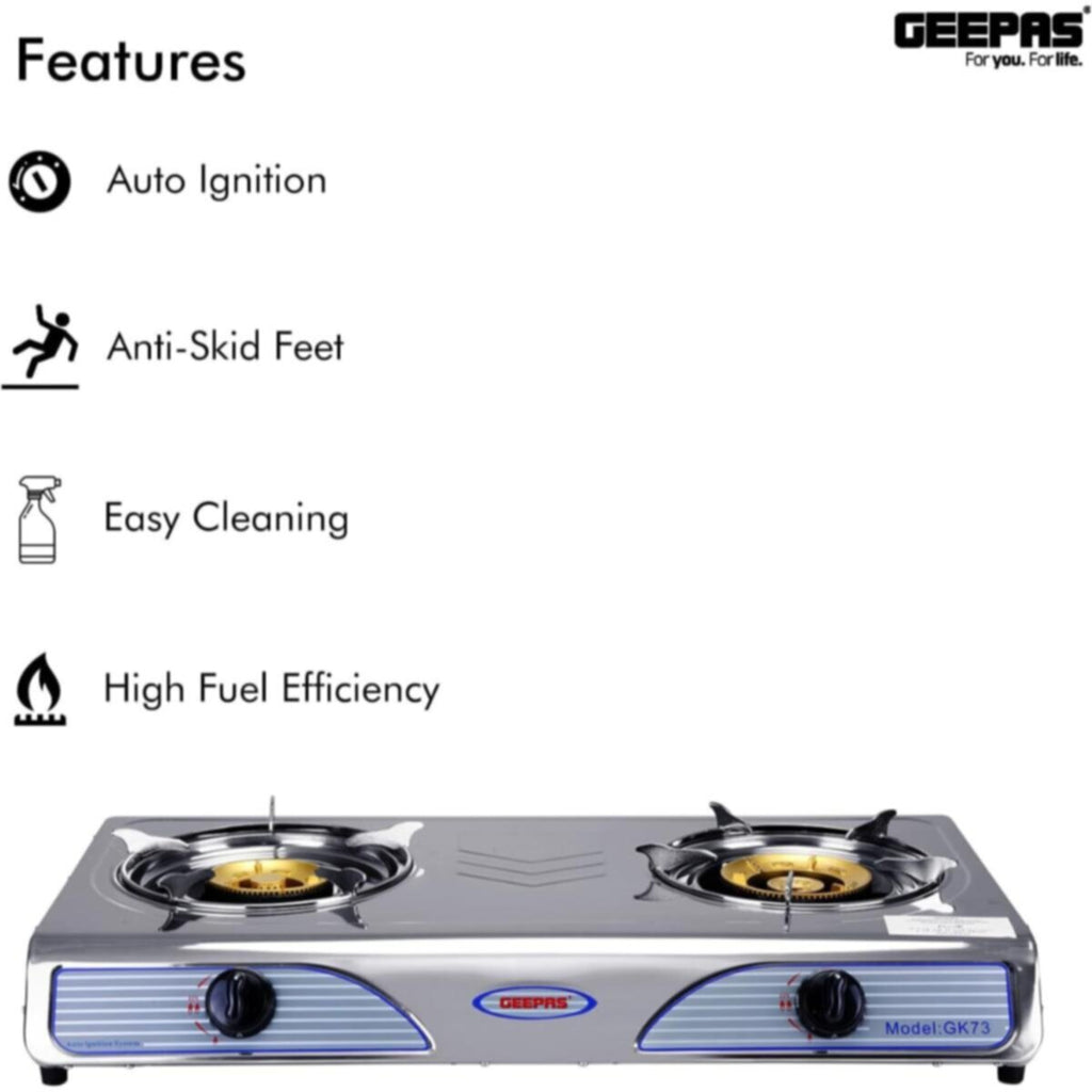 The durable Geepas GK73 gas cooker has stainless steel body. This is a must-have in every kitchen for speedy and hassle-free cooking. Embedded with two burners of sizes 120mm & 100mm, which are auto-ignited, this product offers safe, convenient and time-saving cooking. The product weighs 6 kg and requires LPG to function.
