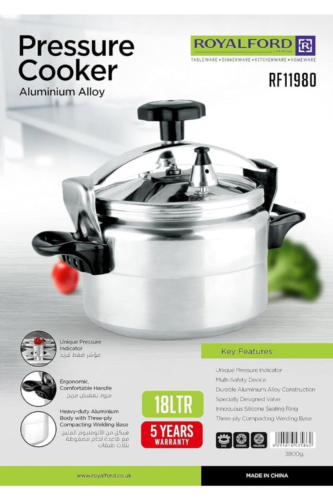 استمتع بمذاق التقاليد مع أقصى درجات الأمان في راحة منزلك. تقدم رويالفورد طنجرة ضغط ألومنيوم متينة وفعالة بقاعدة ملحومة ثلاثية الطبقات. تتميز هذه الطنجرة بتعدد استخداماتها، وهي مثالية للطهي الصحي في حياتك اليومية. صُنعت الطنجرة من مواد عالية الجودة وآمنة للاستخدام مع الطعام، وهي مصممة لتدوم طويلًا. بسعة كبيرة تبلغ 18 لترًا، تُناسب هذه الطنجرة طهي الطعام لجميع أفراد العائلة. إنها مثالية للسلق والطهي البطيء، مثل تحضير الأرز والكاري والعصيدة والحساء وغيرها. تتميز الطنجرة بتصميمها الخاص وميزات أمان متعددة لضمان سلامة الجميع. يعمل الصمام المصمم خصيصًا على تنظيم ضغط البخار، مما يضمن طهيًا سريعًا وآمنًا، وبالتالي توفير وقتك. يقوم مؤشر الضغط الفريد الموجود على الغطاء بتحرير الضغط تلقائيًا عند تجاوزه الحد الآمن، مما يجعلها آمنة للغاية للاستخدام. صُممت المقابض هندسيًا لتوفير قبضة ثابتة ومريحة، حتى مع الأيدي المبللة. كما أنها متينة ومثبتة بمسامير لتحمل الوزن عند رفع الطنجرة. حلقة الإحكام المصنوعة من السيليكون الآمنة صحية وتضمن أقصى درجات الأمان. كما أنها تعمل كمنفذ آمن لتفريغ الضغط الزائد. يتميز قدر الضغط بقاعدة سميكة تضمن توزيعًا متساويًا للحرارة. صُمم القدر ليعمل على مواقد الغاز والسيراميك والهالوجين. وهو سهل الاستخدام. يُعد قدر الضغط المصنوع من الألومنيوم عالي الجودة هدية مثالية لحفلات الانتقال إلى منزل جديد، والذكرى السنوية، وحفلات الوداع، وغيرها.