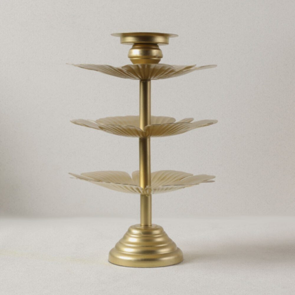 The Arianna candle holder is just what you need to take your candle lighting experience to the next level. Made from iron, the holder is resistant to corrosion. The candle holder features 3 lotus-shaped tiers, which are perfect to place any of your small valuables like rings, earrings, or decorative stones. Also available in varied sizes.Dimension : 25X25X52.5cm