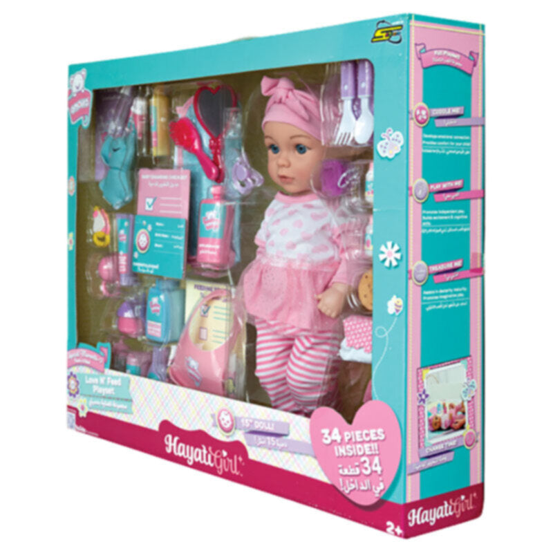 • دمية بجسم بلاستيكي مع أكثر من 30 ملحقًا ممتعًا.