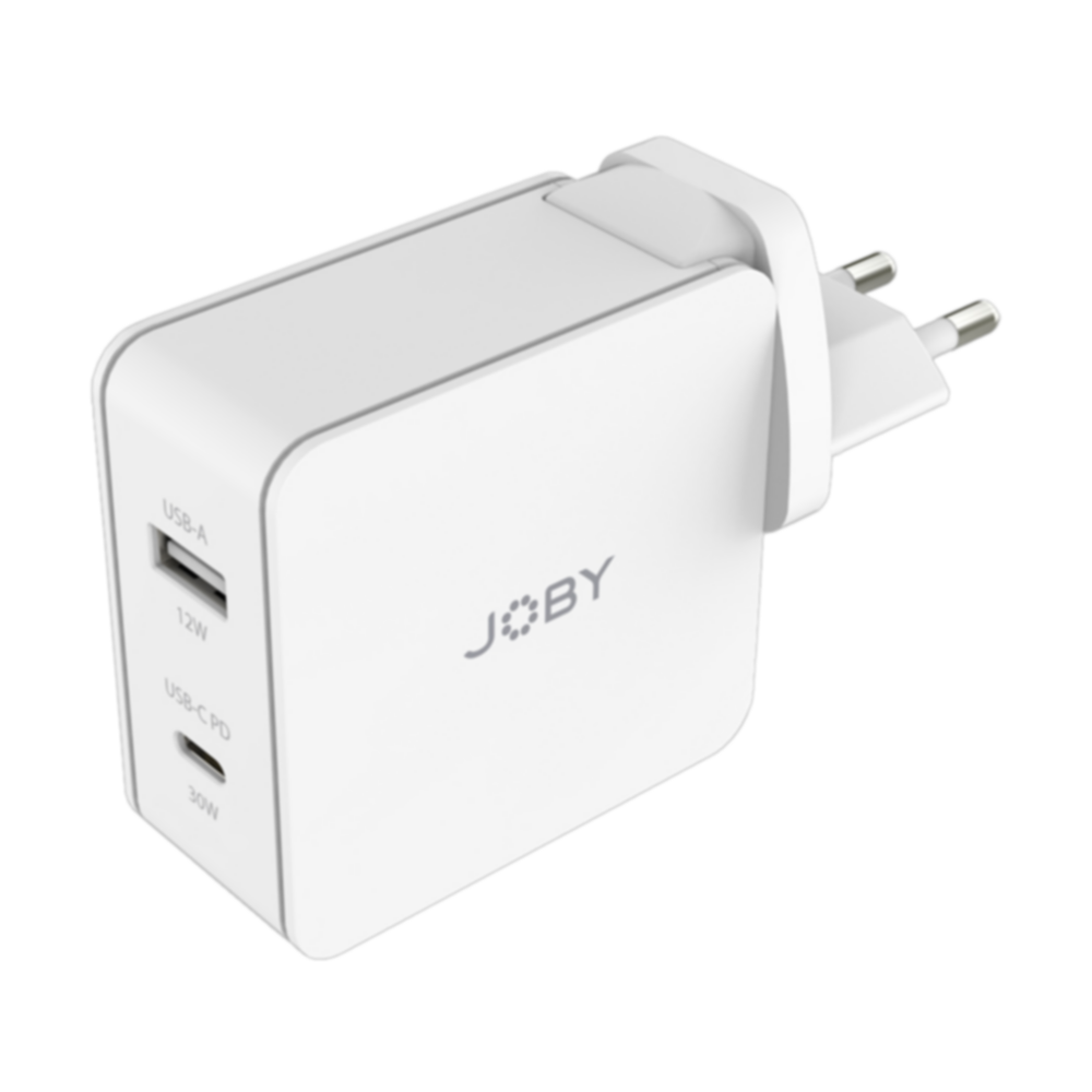 Dual output wall charger with separate 30W USB-C PD and 12W USB-A fast charging ports. 30W PD fast charging for iPhone 14, 13, 12 and legacy iPhone, iPad Pro, iPad Air, PD enabled Android devices, PD enabled camera or MacBook Air/MacBook Pro. Compact and portable wall adapter ideal for home, office or on the go to keep all your devices powered. Charges MacBook/MacBook Air at maximum speed. Charges MacBook Pro 13â€/16†at 30W (note that higher powered chargers will charge faster). Input: AC 100-240V 50/60Hz, 1.2A. Output USB-C (PD 3.0): DC 5V 3A, 9V 3A, 15V 2A, 20V 1.5A (30W). Output USB-A: DC 5V 2.4A (12W). Total Max Power 42W. Built-in US plug with removable UK and EU plug adapters for UK/EU/US plug compatibility.