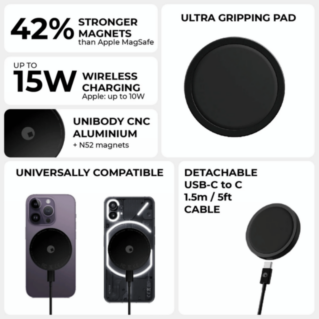 ◆ EDGE® Pro Wireless Charger: EDGE® Pro Wireless Charger is fully compatible with iPhone MagSafe devices (12 and above), as well as iPhone 8 and above all Android devices that support wireless charging, thanks to the included Metal Ring, that allows a strong magnetic attachment even for non-MagSafe devices. EDGE® Pro Wireless Charger can charge your devices up to 15W, it's made of CNC machined aluminium and equipped with strong N52 magnets. Every EDGE® Pro Wireless Charger includes a USB-C to C cable (1.5m / 5ft) that supports fast charging up to 60W. Thanks to its detachable cable design, you can use the included cable or use any other Type-C cable with the EDGE® Pro Wireless Charger.