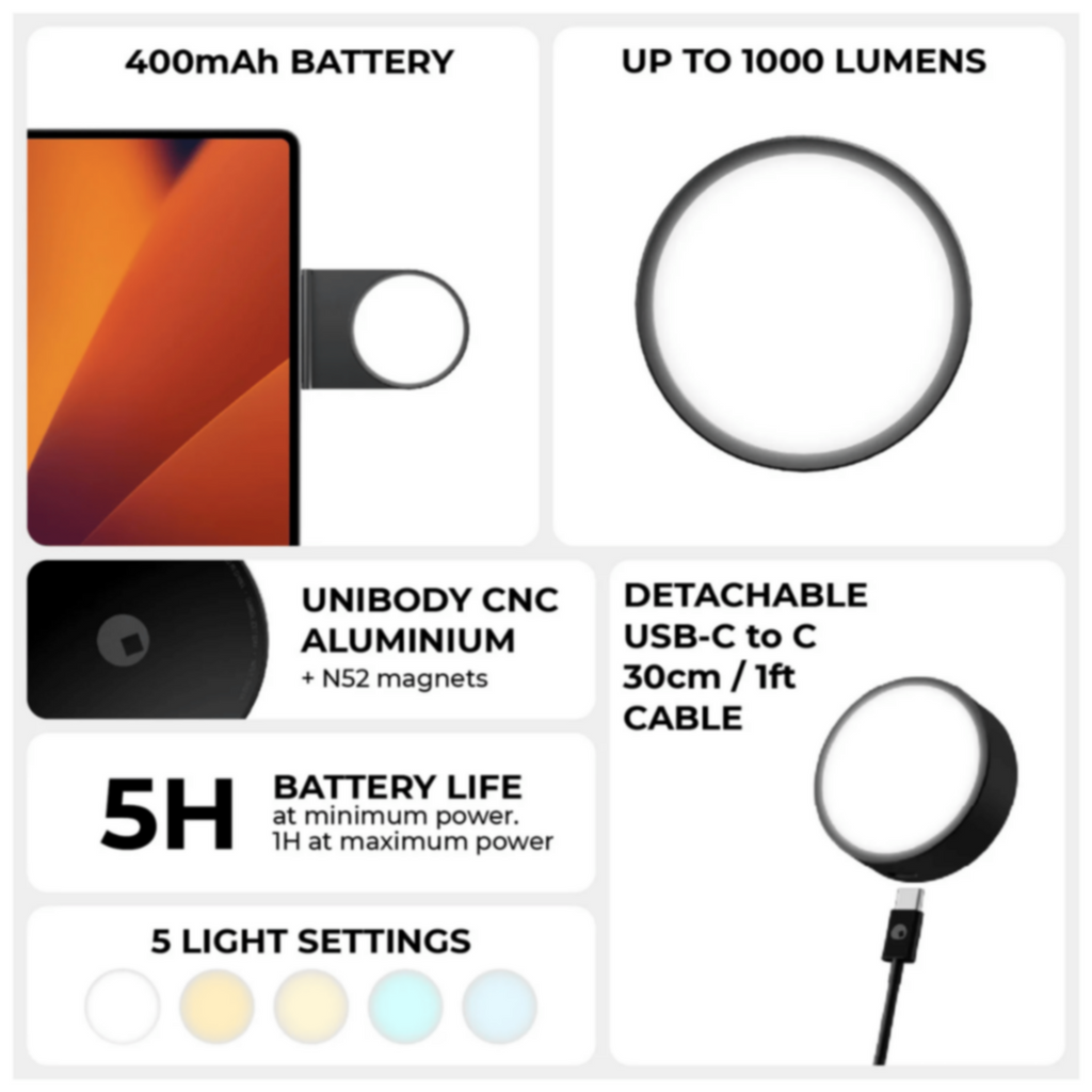 ◆ EDGE® Pro Light: EDGE® Pro Light magnetically snaps on the EDGE® Pro Core. It’s been designed to light up your calls and your workspace, with improved features like the 1000 lumens brightness, 5 different brightness/temperatures levels. Thanks to its built-in battery, you can light up your meetings with or without the included C to C cable (30cm / 1ft), enjoying 1 hour of pure brightness at maximum power or up to 5 hours of light at the lowest intensity.