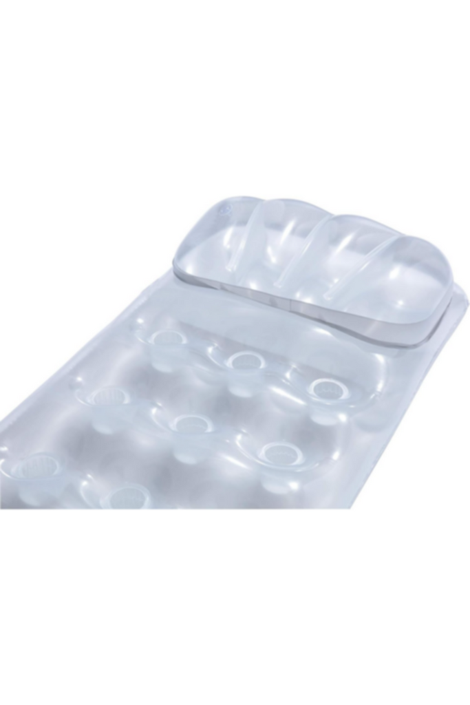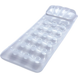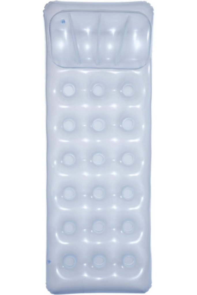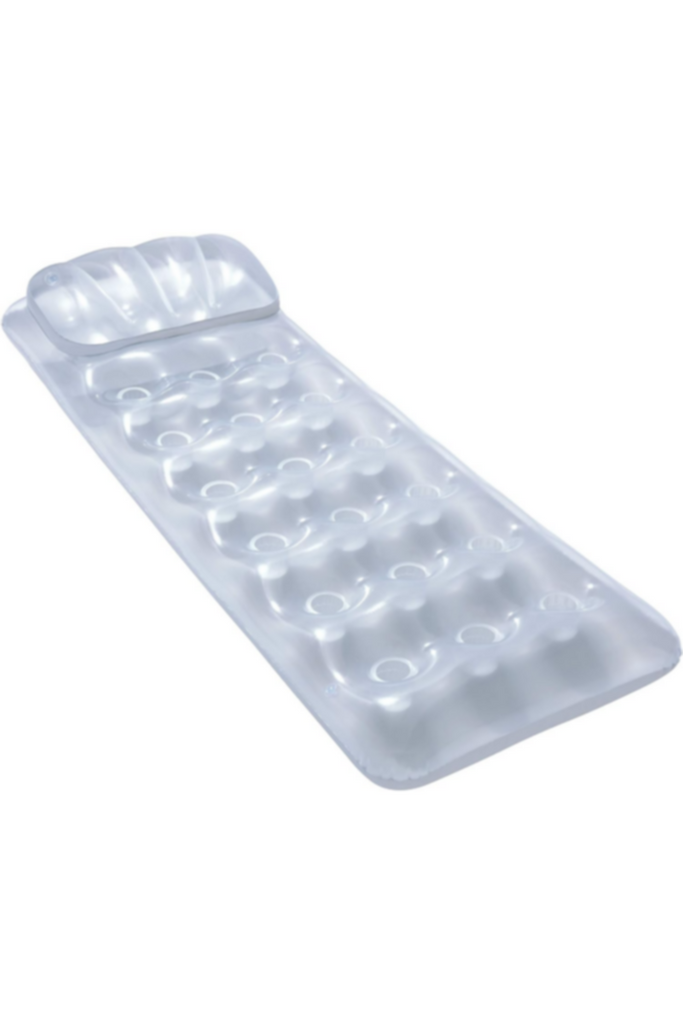 1.88m x 71cm (74" x 28") Safety valves Sturdy pre-tested vinyl 2 air chambers Sturdy coil beam construction Comfortable I-beam pillow Transparent top Repair patch Full color box Max.