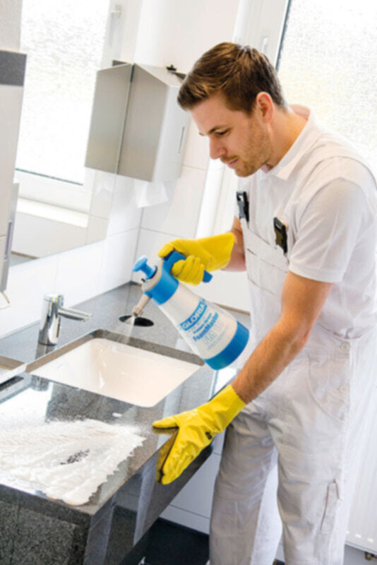 1 l foam sprayer GLORIA FoamMaster FM 10 is equipped with hard-wearing FKM seals as well as an integrated flat jet nozzle with a 110° spray angle and transforms cleaning agents into effective cleaning foam that can intensely take effect on the surface to be treated and achieve in-depth cleaning results. Moreover, cleaning foam is economical in use, and considerably less agent is needed. Different degrees of foaming are necessary for different applications. Therefore, the mode of action of FM 10 can be changed without much effort by fitting different nozzles. The specially designed flat jet nozzle moreover provides for an even output of the medium. A powerful pressure pump, a sturdy plastic tank as well as a bottom ring for a safe stand always guarantee comfortable working.