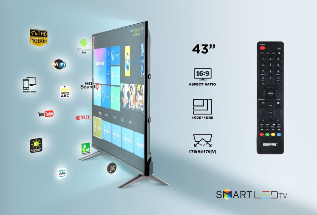 • تلفزيون ذكي LED بنظام أندرويد مقاس 43 بوصة، شاشة LED رفيعة، منفذ 3.5 ملم، منفذي HDMI، ومنفذي USB عاليي السرعة