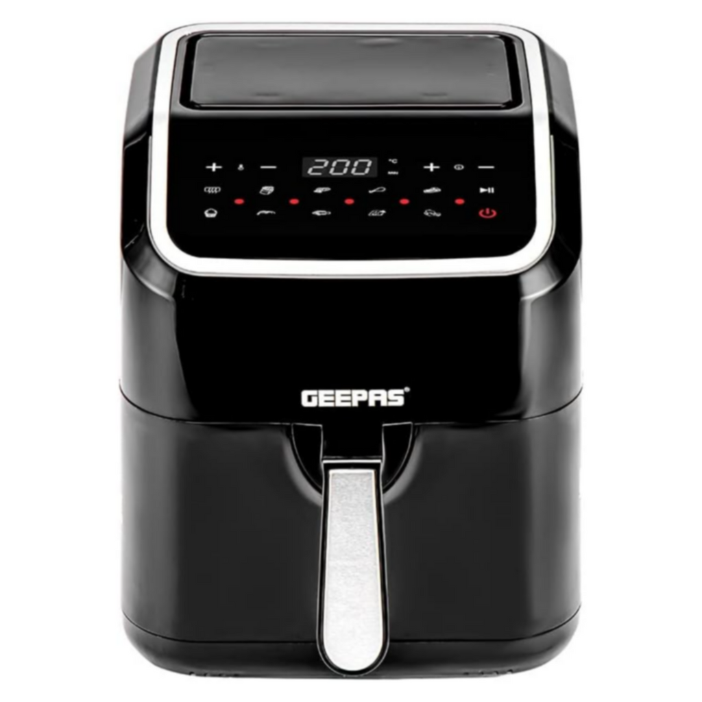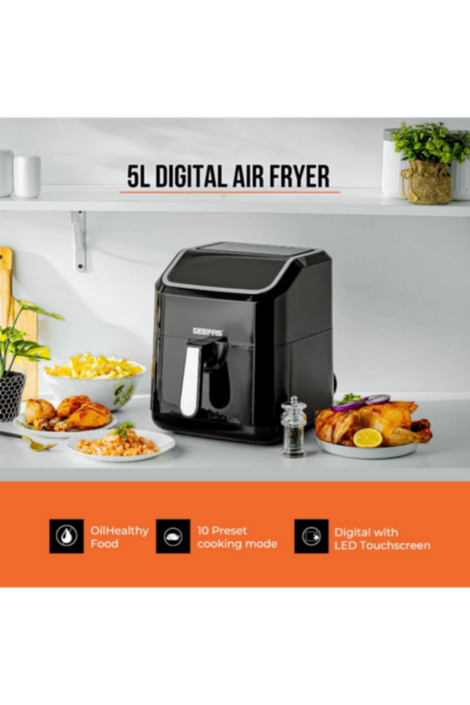Get creative in the kitchen and get rid of messy oil and unhealthy cooking. With the Geepas digital air fryer, you can prepare healthy and delicious food without using any oil. This air fryer is made of premium-quality materials and is designed and manufactured to make everyday cooking easier. The 5-liter digital air fryer ranks high in both looks and efficiency and is ideal for cooking perfectly cooked, healthy, low-fat food without oil for the entire family. The air fryer uses VORTX air frying technology that cooks 30% faster with 99% less oil and ensures that the food is not greasy. It helps you prepare delicious foods that are crispy on the outside and tender on the inside with little to no added oil. The fryer has a touchscreen LED display with ten preset cooking programs that let you set the timer from 1 to 60 minutes. In addition, it has a temperature range of 50 to 200 degrees Celsius. It also shows the progress of the food being fried. Preset programs include grilling, air frying, baking, roasting, and much more. You can cook various food items in it, including fries, chicken, sausages, cake, bread, cake, and more. The air fryer is highly durable and corrosion-resistant and can serve you well for many years. The basket is made entirely from the finest quality material, is gentle on food, does not flake off, and is hygienic and safe to use. It does not get greasy, so you can get your fried food out with ease. The strong and sturdy construction provides you with an effortless cooking experience. The air fryer is also easy to clean and maintain. The simple design, black color, and utility features make it an ideal option for your kitchen, and it is also an excellent choice for gifting. The product weighs 4.75 kg. The Geepas digital air fryer comes with a 2-year warranty