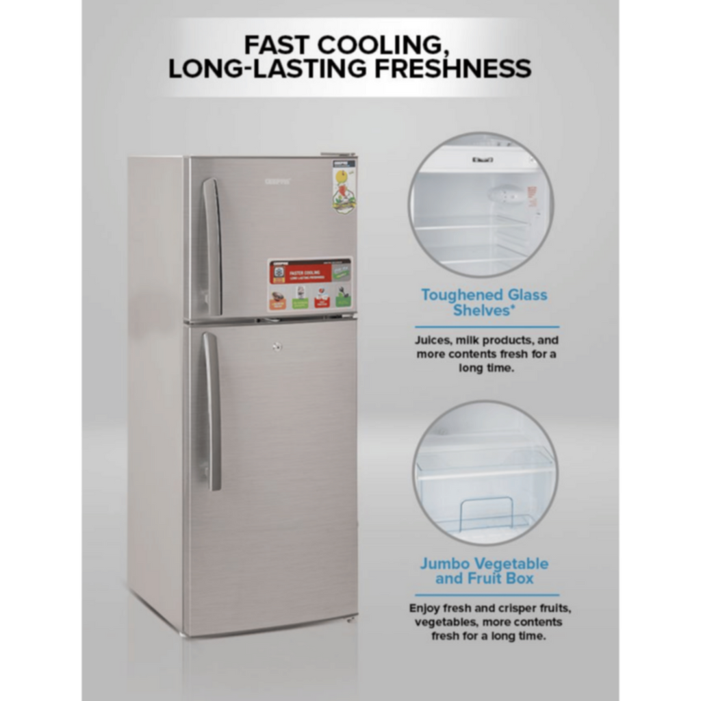 â—† FAST COOLING, LONG-LASTING FRESHNESS, AND DEFROST REFRIGERATOR - Geepas dual door refrigerator has rapid cooling performance & avoids holding ice. chill your drinks in no time. Enjoy fresh and sort crisper fruits, vegetables, meat, fish, Juices, milk products, and more contents fresh for a long time.