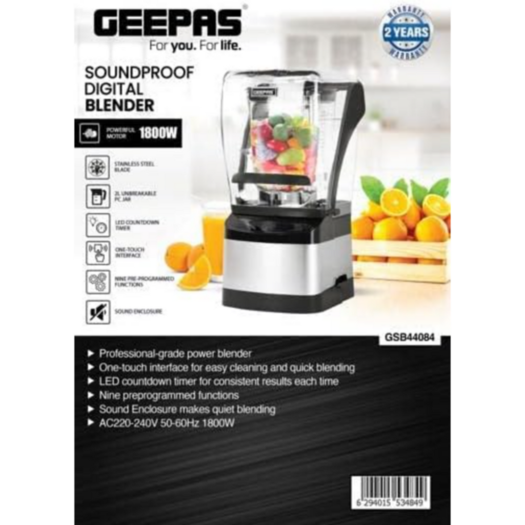 Our Geepas Sound Proof Digital Blender can be used as an ice cream machine, milkshake machine, smoothie machine and ice crusher. As a blender multifunctional, it can mix various vegetables, fruits, nuts and grains, quickly extract vitamins from these ingredients, and fully mix them. With this blender with a sound enclosure, through the design of an all-wrapped soundproof cover, the sound can be blocked to realize low-noise and large-volume mixing, which makes it possible to mix quietly at home and in a large number of shops, and the soundproof cover can be easily disassembled, making it possible to feed and stir. 1800W of professional power and heating elements, can crush ice, and tasty drinks and grind ingredients for the sauce. 2L large capacity, perfect for 6 starter portions or 4 large portions, which is the best option for families. High-tech LED display and one-touch interface for easy cleaning and quick blending. The sharp stainless steel blades of this blender make it ideal for crushing frozen fruit, ice cubes, milkshakes, cocktails, sauces and more. This blender is easy to use as it comes with nine preprogrammed functions so you can prepare different dishes with perfection. Simply plug in this electric blender, lock the parts together and go. This is one of the easiest food blenders to use. You'll have no problem finding the perfect speed to blend any foods or drinks. This blender is easy to clean just wash it under running water.