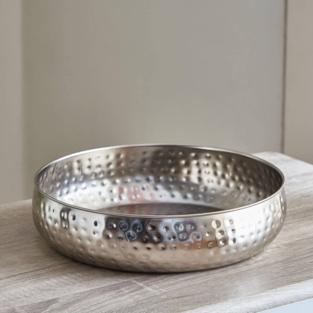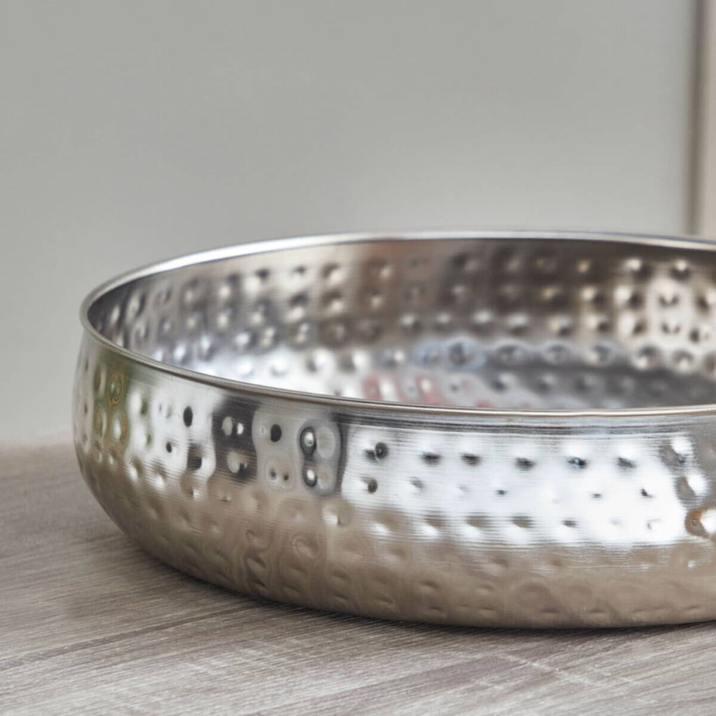 Lend a traditional touch to your home interior with this decorative urli. It highlights a beautiful hammered finish and is well-crafted from durable metal. It is perfect for housing scented potpourri or floating candles. This decorative piece has easy maintenance and will surely charm your guests. The product images have props used for illustrative purposes.