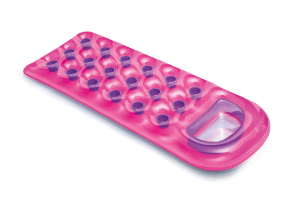 Relax and enjoy the pool with the Intex 18-Pocket Suntanner Mat. Designed with a clear vinyl top, color pockets and coil-beam construction, this lounge has a built in see-through window that doubles as a contoured pillow for extra comfort while you float.