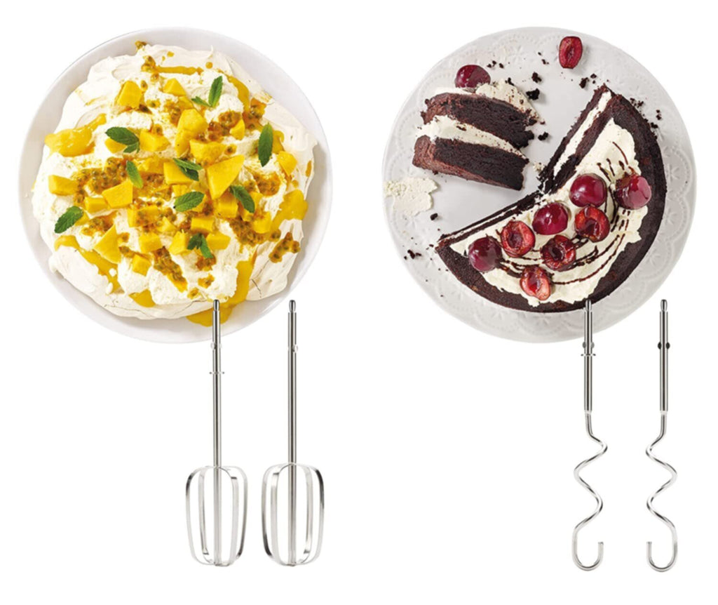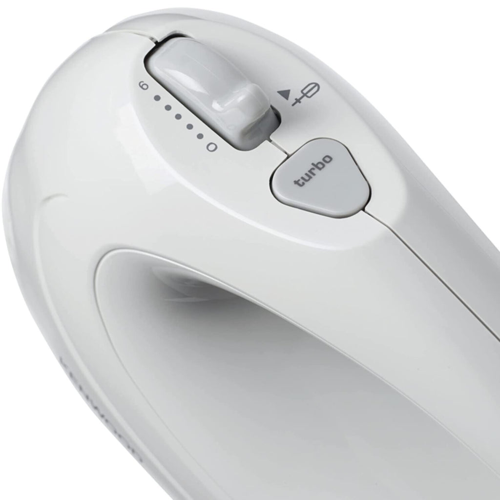 يأتي الخلاط اليدوي الأبيض HM330 صغير الحجم ومتين بست سرعات بالإضافة إلى سرعة التوربو، ومضارب مزدوجة وعجانات للطي والخلط والخفق والعجن.