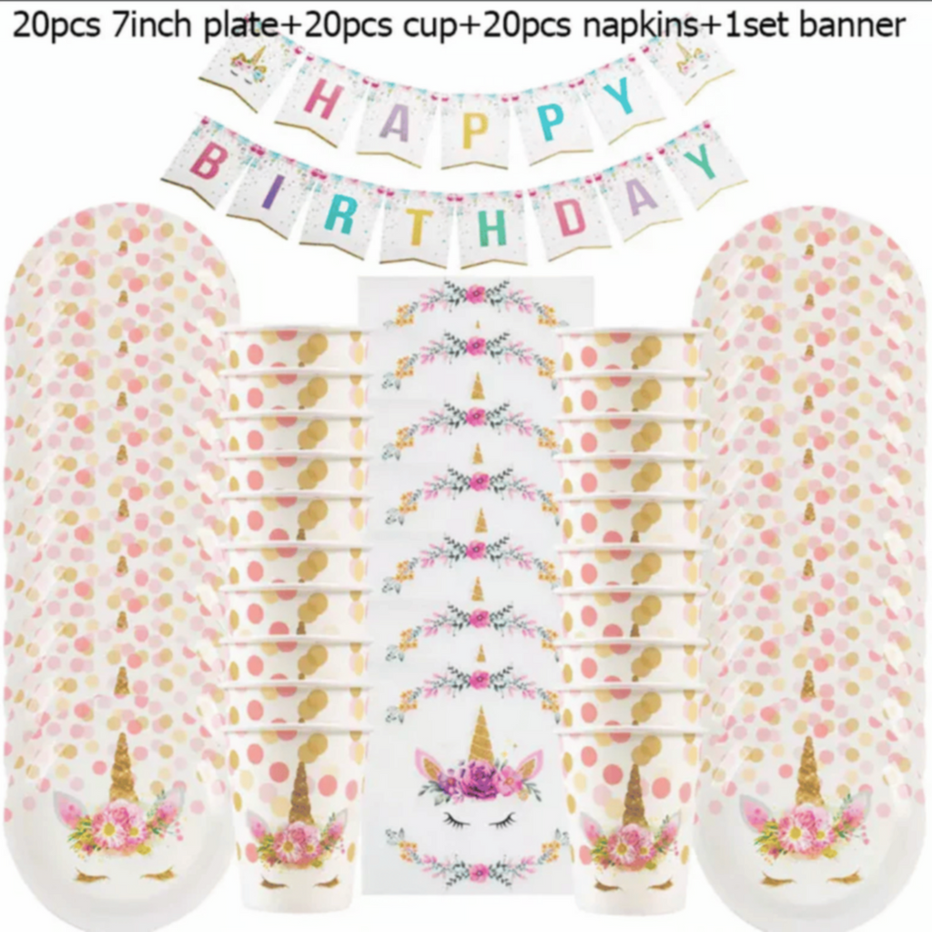â—† 61 pcs Unicorn Birthday Party Decoration Tableware, 20 pcs Plates 7 inch , 20 pcs cups, 20 pcs Napkins, 1 set Banner.