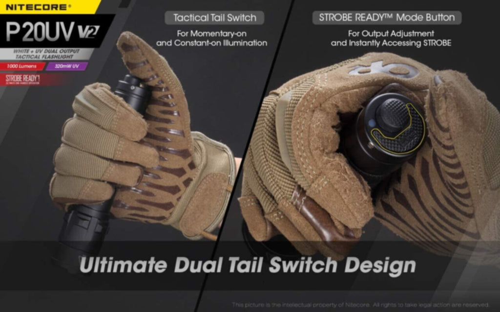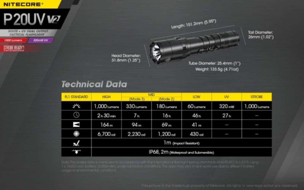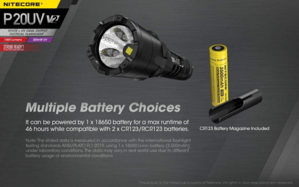 â—† Refined Tactical Flashlight - The Nitecore P20UV v2 has been refined to provide you with the best possible tactical experience, firing 1000 lumens over 179 yards, with 2.5 hours of run time on high and up to 46 hours on low. â—† Ready to use: the P20UV v2 fits perfectly in the included NTH20 case. At less than 6 inches and only 4.71 ounces, an IP68 rating and 3.3 feet of impact resistance; the new P20UV v2 is ready for work. â—† Versatile Battery Options - The P20UV v2 is powered by a single 18650 battery or 2 CR123A batteries, incredibly versatile and widely compatible. Includes CR123A charger. â—† Customizable Operation: Select Tactical, Law Enforcement, or Daily mode to customize your operation while maintaining direct access to the strobe and turbo. â—† P20UV v2 Starter Pack - Included in this pack are Nitecore P20UV v2, CR123 battery charger, NTH20 holster, lanyard, clip, replacement O-ring, and 2 LumenTac CR123A batteries.