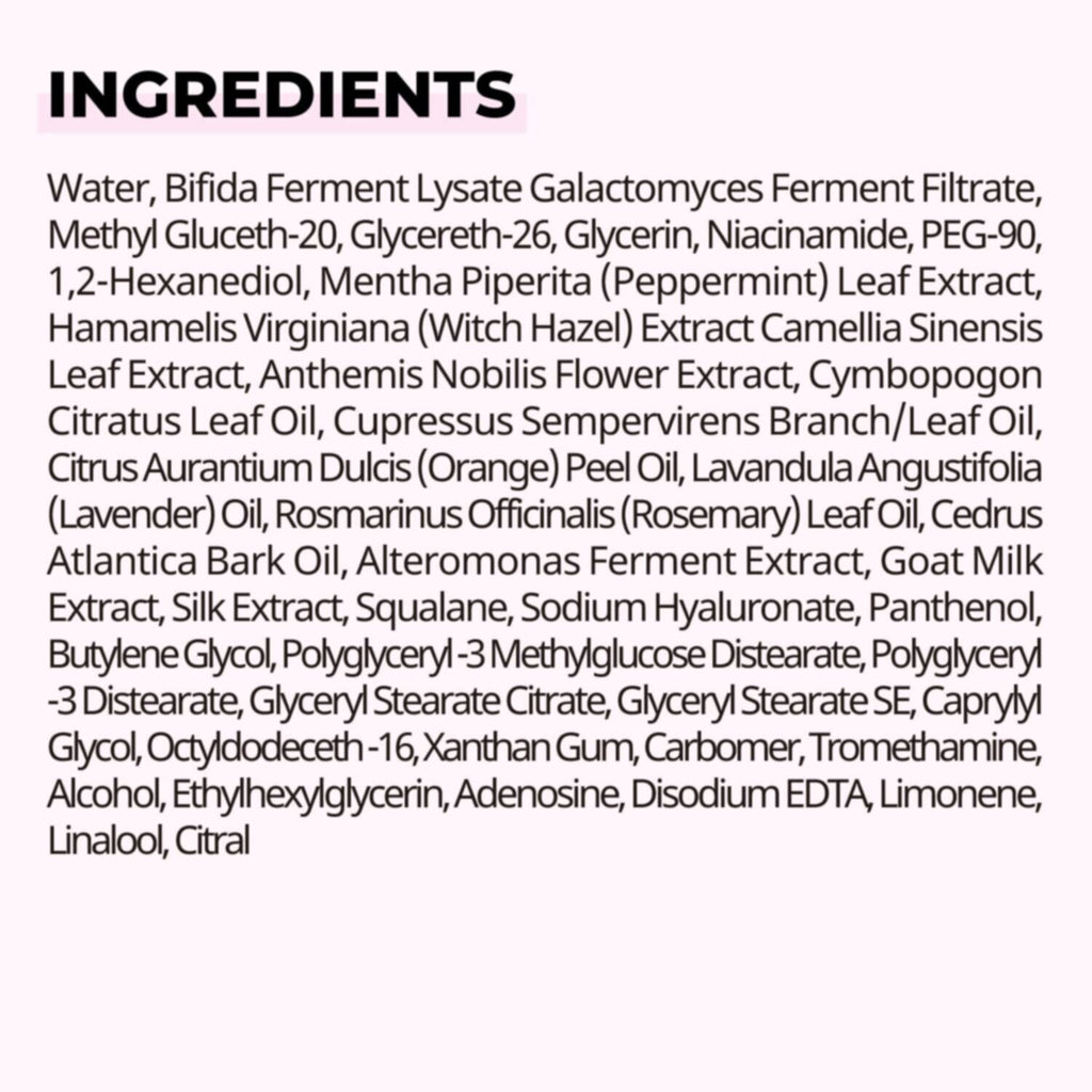 â—† KEY INGREDIENT : Bifida, Tingle pore omplex, Mentha piperita leaf extract, Camellia sinensis leaf extract, hamamelis virginiana extract, Lavadula angustifolia oil, Anthemis nobilis flower extract.