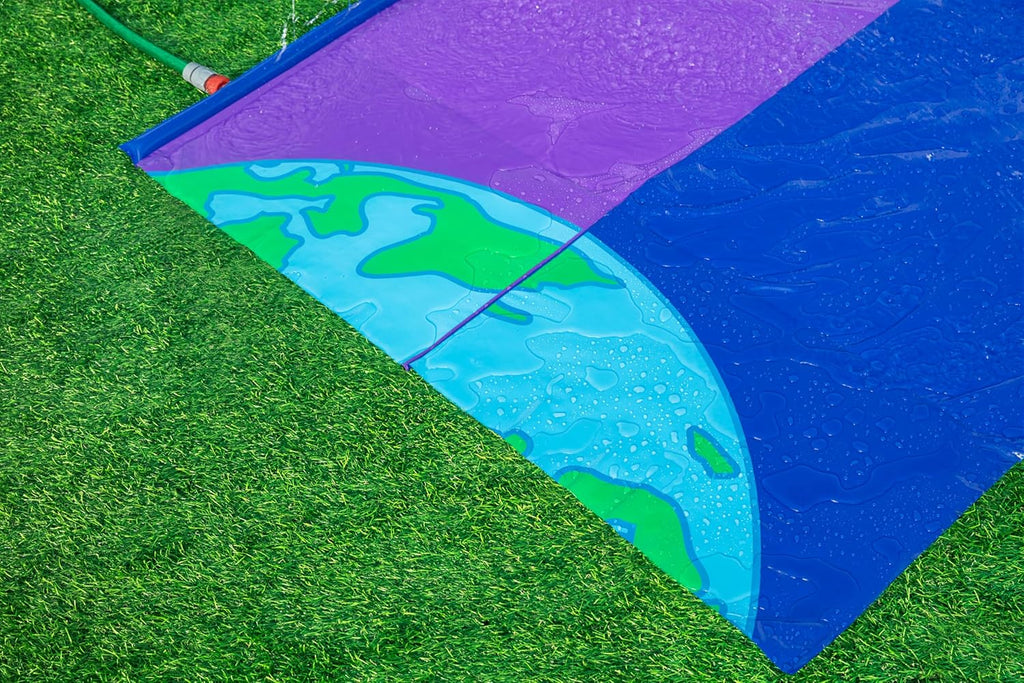 Made from durable PVC for long-lasting use, the slide features dual racing lanes, a drench pool for soft landings, and an integrated SplashBoostâ„¢ sprinkler system that keeps the surface slippery and fun. Just connect it to your garden hose for instant water action! Cleanup is easy with a convenient drain valve.The set includes 2 inflatable mini surfboards for added excitement and a repair patch for quick fixes.