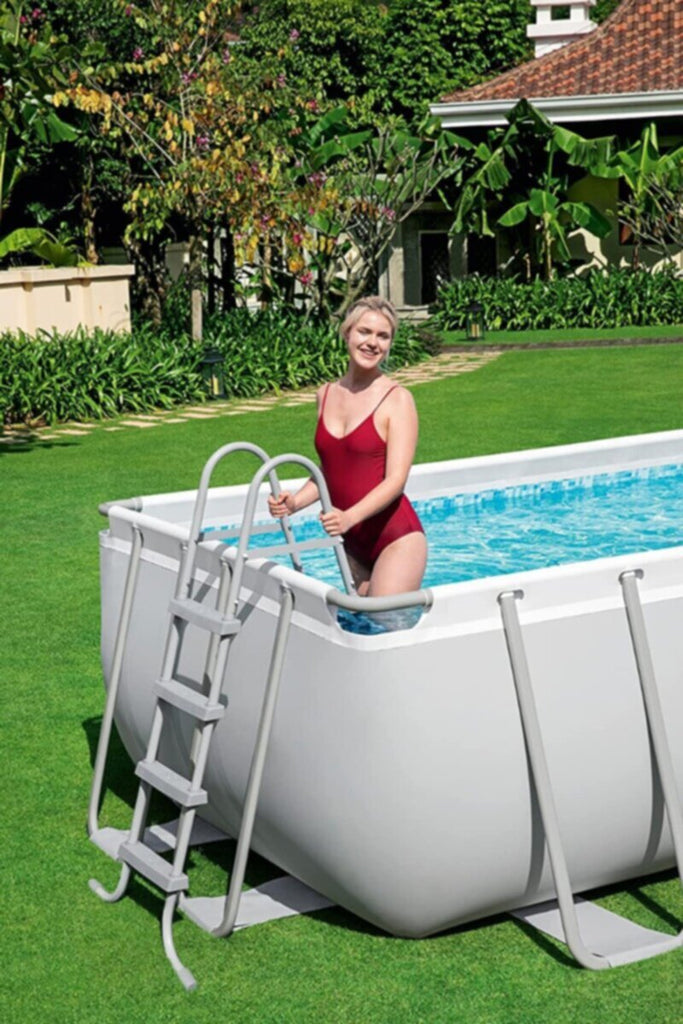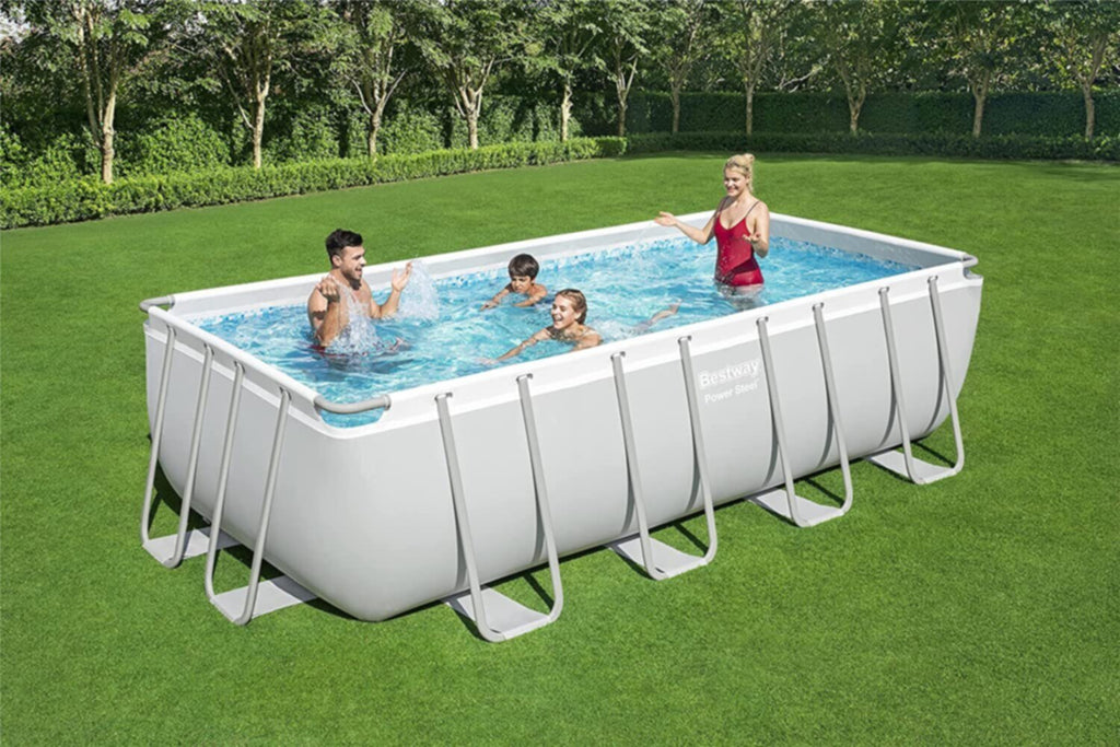 • طقم مسبح مستطيل من الفولاذ المتين، أبعاده 5.49 متر × 2.74 متر × 1.22 متر (18 × 9 قدم × 48 بوصة)، سعته 14.812 لترًا (3.913 جالونًا). سهل التركيب. جدران جانبية متينة من ثلاث طبقات من مادة PVC والبوليستر.
