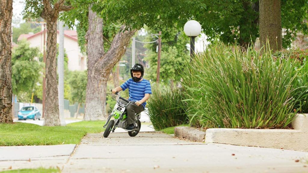 Inspired by the winningest supercross rider in history, Jeremy McGrath. Complete with authentic McGrath graphics and MX-frame geometry, the SX350 scales Jeremy’s iconic bike down to size for younger riders. Carries riders at speeds of up to 14 mph (22 km/h) with up to 30 minutes of continuous use. Features adjustable-angle, riser-style handlebars, spoked wheels with 12? pneumatic, knobby tyres, retractable kickstand, and hand-operated rear brake.