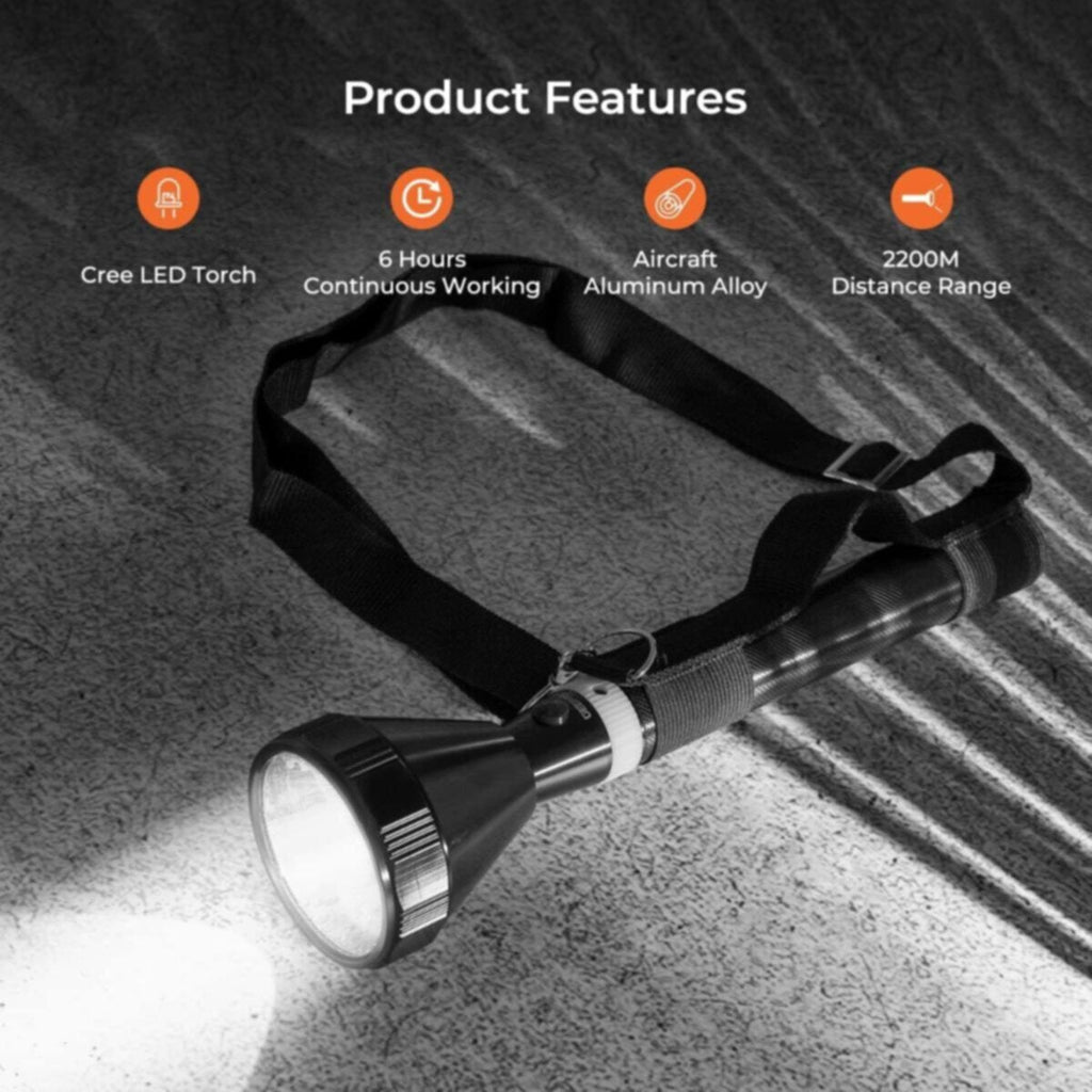 This Geepas Led Torch has a high-intensity light with CREE led gives a cool bright white light which is less harsh and gives you a day time appearance. This torch is very much useful in emergency light in case of power failures at your home.2. HIGHLY DURABLE ALUMINIUM BODY - Built-up with the durable extra hard anodized-aluminum body which is anti-skid, shock resistant, and sustains even by rough handling. If you are looking for quality & durable torch for hard use than it's something perfect for you.3. 2500mAh RECHARGE BATTERY & REAL RANGE DISTANCE OF 2000 METERS -This torch has an immense wavelength and is capable to reach a long distance with a maximum range of 2000 meters. It provides you to see objects, persons, or any other thing from a longer distance in darkness. It is gets fully charged in 10 hours and give continuous 6 hours working.4. HIGLY DURABLE ALUMINIUM BODY - Geepas Led Torch is made up of aluminium body as it capable to sustain with rough use and it is anti-skid, shock resistance, anti-rust and even used in low rains.
