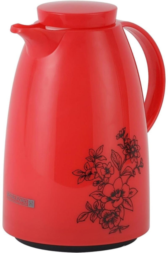 b"Choose this elegant vacuum flask for any time of the day to enjoy with your family. The Royalford vacuum flask from the Jenna series, with a sturdy and durable pink glass inner pot and a premium-quality outer body with a handle, makes it convenient for enjoying your favourite beverage anywhere. The 1L (33.5 oz) flask is constructed from high-quality materials and is 100% food-grade, asbestos-free, non-toxic, corrosion-resistant, and safe to use. The flask is designed to provide you with a healthy way to keep your drinks hot or cold for longer. Fill it with your favourite iced lemonade or hot coffee, and relax with your family or friends. It also holds onto heat or cold, keeping your beverage just the right temperature for a wonderful drinking experience. It is attractive and sturdy for storing water or other beverages such as tea, coffee, kahwa, juice, smoothies, milkshakes, etc. It is convenient to use at home while travelling, hiking, road-tripping, visiting hospitals, camping, etc. The vacuum flask has a durable and leak-proof lid and allows you to enjoy your drink without worrying about spillage, cracking, denting, or leaking. It is also mess-free. The lid seals strongly to preserve the contents' flavours and freshness. The pouring spout allows you to control the liquid while pouring. The ergonomically designed handle provides a comfortable and firm grip. It is strong enough to withstand the contents' weight while pouring. The wide mouth makes it easy to fill and clean. Its elegant design, red colour, and floral detailing make it an attractive option for everyday use. It is smart, stylish, and the right companion for your everyday life since it is crafted with food-grade materials.