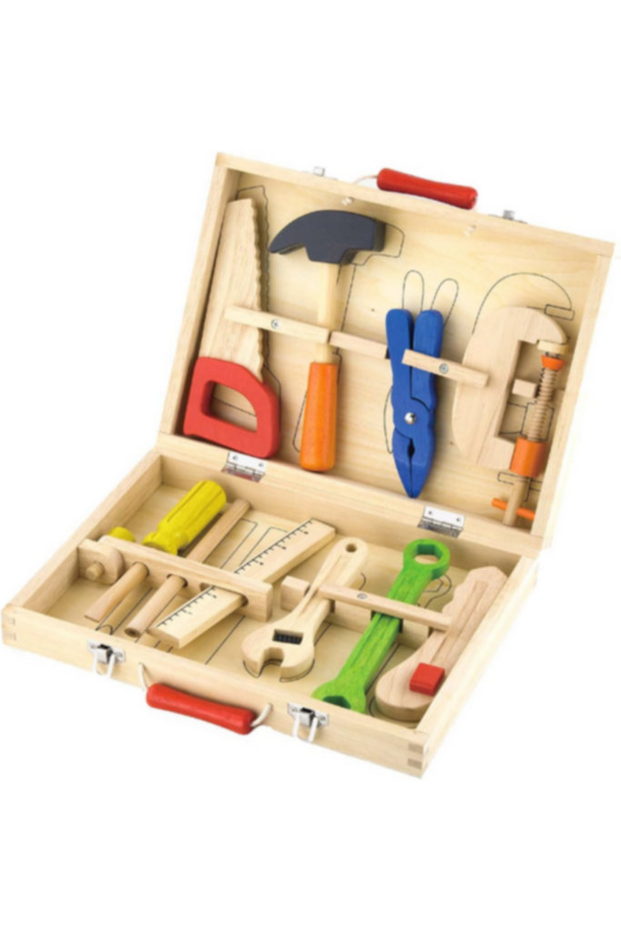 â—† 10 beautiful wooden tools stored inside a sturdy wooden case.