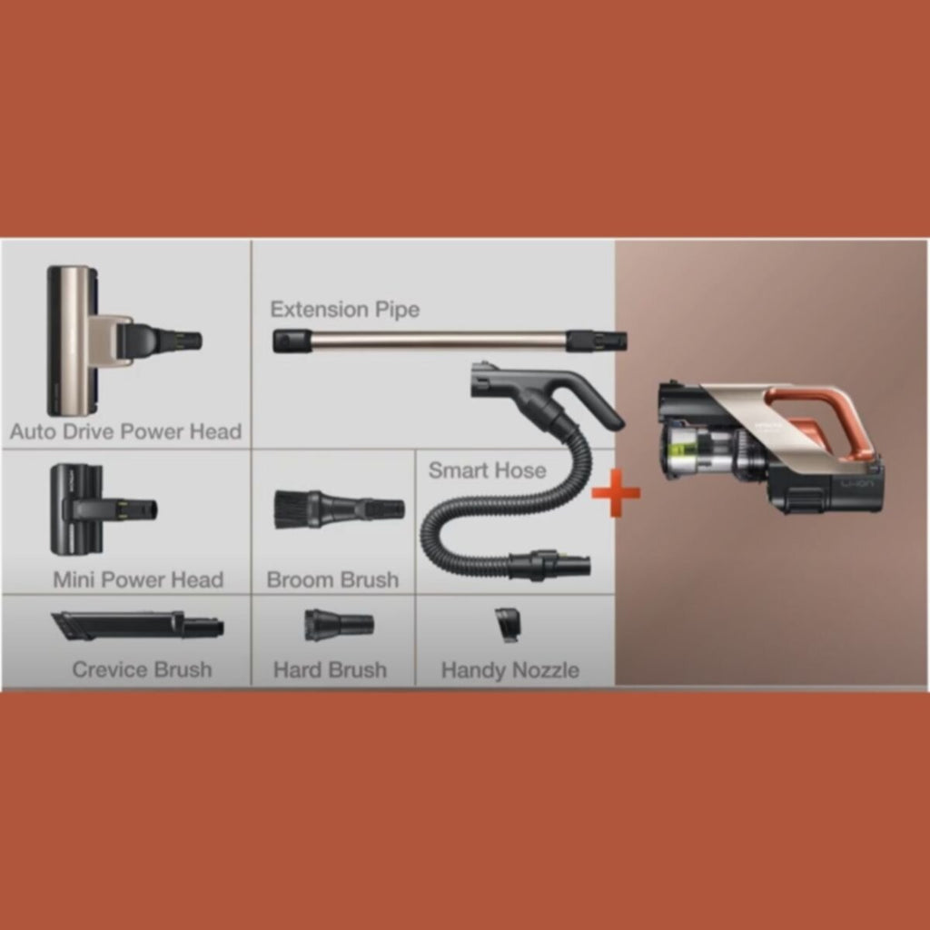 | Accessories | Mini Power Head, Crevice Brush, Handy Nozzle, Smart Hose, Broom Brush, Hard Brush, Charging Station, Maintenance Brush, Extension Pipe |