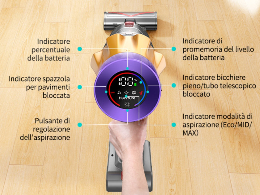 Color Touch Screen Display: The digital touch screen allows you to monitor and adjust the working status of the stick vacuum cleaner at any time. It is especially suitable for households with pets because it deeply removes embedded debris and dirt such as cat litter, dog food crumbs, pet hair, etc.