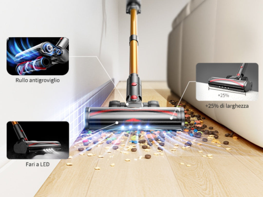 V-shaped Upgraded Flexible Brush: The newly upgraded V-shaped rolling brush can effectively reduce hair entanglement. The brush head of the vacuum cleaner can support 0° to 180° sideways and 0° to 90° up and down swivel steering. 6 bright LED lights, can illuminate the corner, the hidden dust has nowhere to escape to achieve better cleaning.
