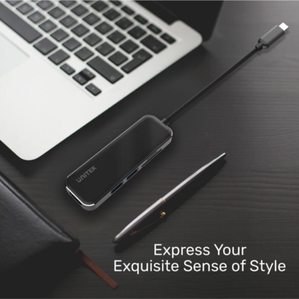 uHUB Exquisite is a USB-C hub series made with an obsidian black tempered glass panel and aluminum-alloy frame to offer exquisite looking and strong durability. D1036A is a USB-C 5-port hub that offers 4K 30Hz HDMI outputs plus dual card readers and 2 USB-A 5Gbps SuperSpeed for USB expansion.