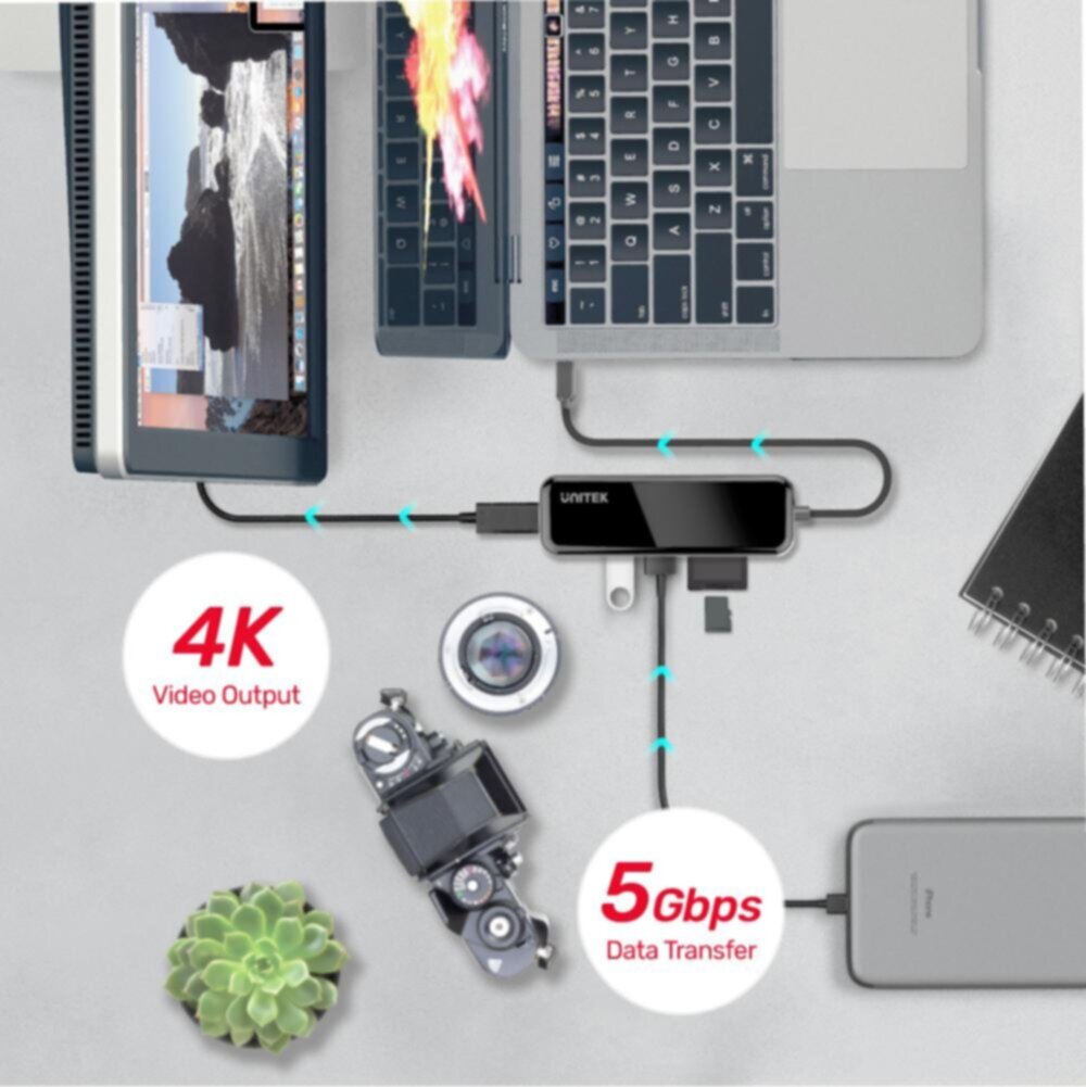 UNITEK | 5-in-1 USB3.1 Gen1 Type-C Hub (2*USB-A + HDMI + Card Reader), Space Grey+Black | D1036A