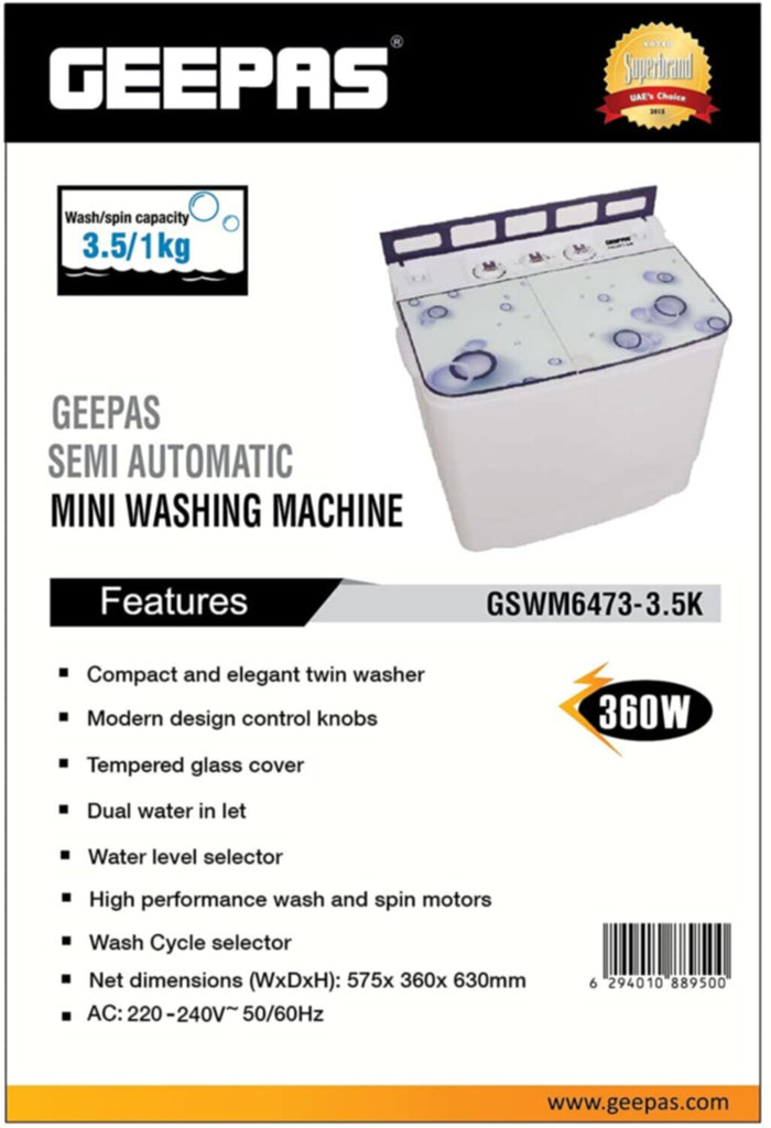 جيباس | غسالة ملابس صغيرة نصف أوتوماتيكية سعة 3.5 كجم وقوة 360 واط | GSWM6473