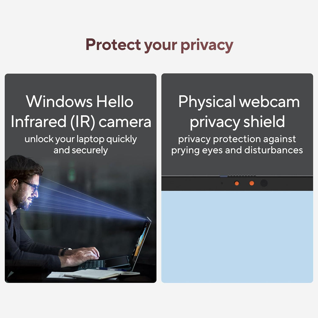 • الكاميرا: كاميرا الأشعة تحت الحمراء عالية الدقة بالكامل مع غطاء للخصوصية، تدعم نظام ويندوز هيلو.