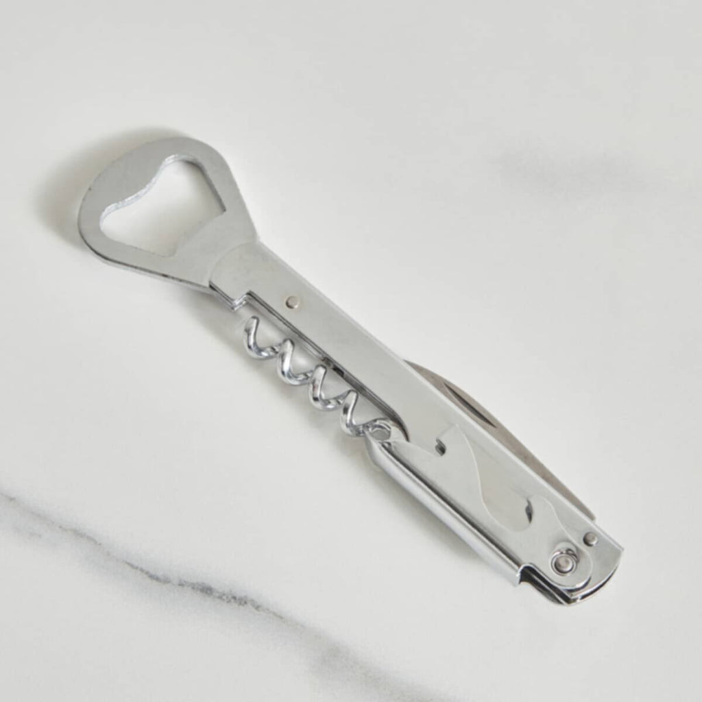ارتقِ بمجموعة أدوات البار الخاصة بك مع هذه المجموعة المتكاملة من فتاحة زجاجات النبيذ، وفتاحة العلب، والسكين. مصنوعة من الفولاذ المقاوم للصدأ والحديد المتين، تجمع هذه المجموعة بين العملية والتصميم الكلاسيكي، لتضفي لمسة من الرقي على بارك. الصور المعروضة لأغراض توضيحية فقط.