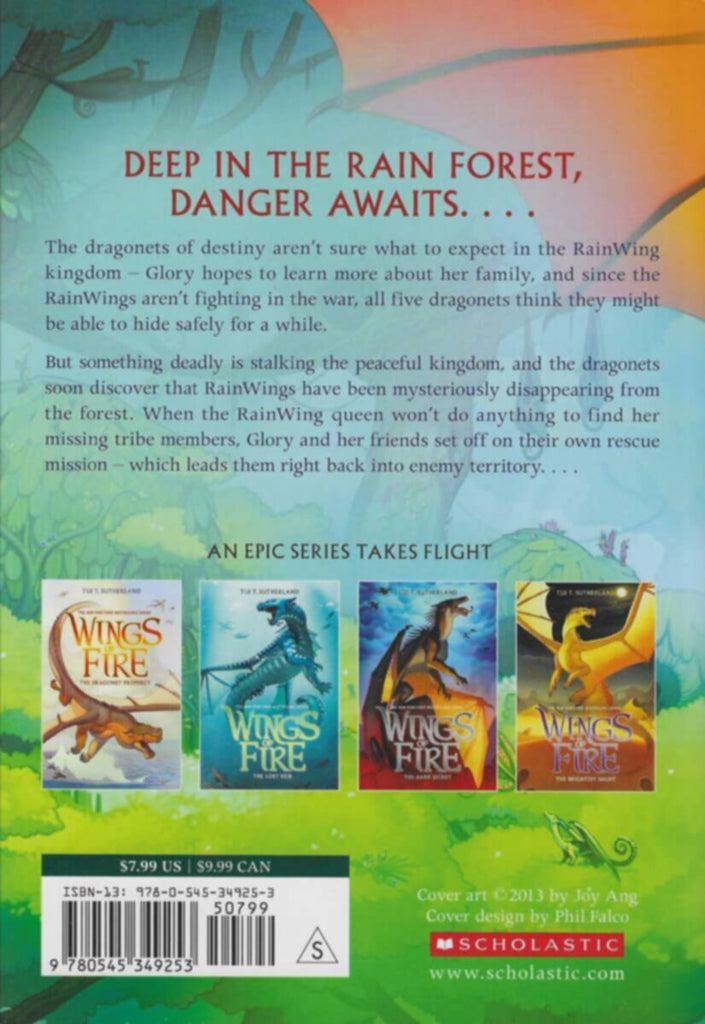 The Wings of Fire saga continues! Deep in the rainforest, danger awaits.... The dragonets of destiny aren't sure what to expect in the RainWing kingdom; Glory hopes to learn more about her family, and since the RainWings aren't fighting in the war, all five dragonets think they might be able to hide safely for a while. But something deadly is stalking the peaceful kingdom, and the dragonets soon discover that RainWings have been mysteriously disappearing from the forest. When the RainWing queen won't do anything to find her missing tribe members, Glory and her friends set off on their own rescue mission, which leads them right back into enemy territory...