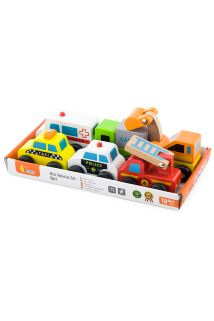 â—† The set includes a police car, ambulance, fire engine, truck, forklift and a taxi.