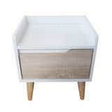 A perfect blend of Glossy white & natural Oak. This nightstand is perfect for those who are looking for a bright & natural look. Its soft design is meant for those who want to create a spacious concept in rooms.. Dimension: L 40 X W 35 X H 42 cm. Material : MDF. Made in China