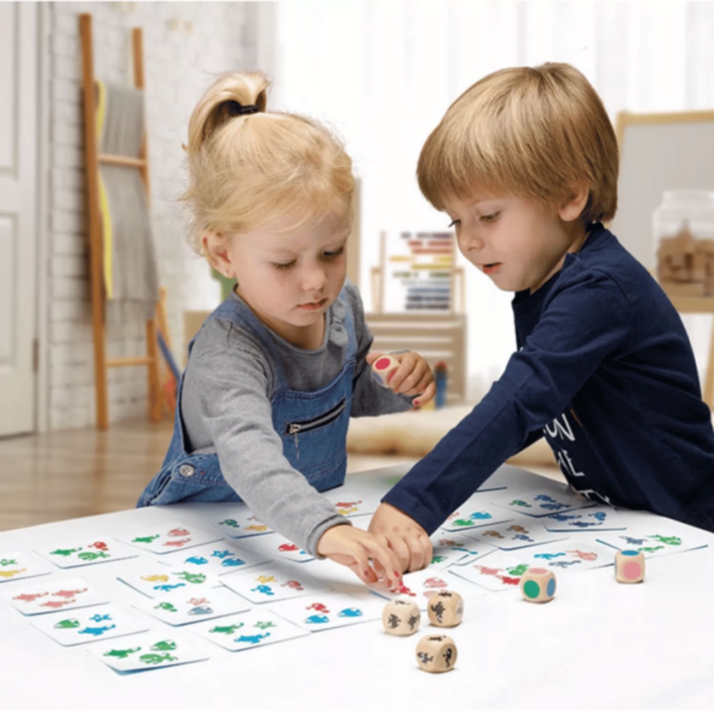 â—† Throw the dice and be the quickest to find the card with the same combination of animals and colours.