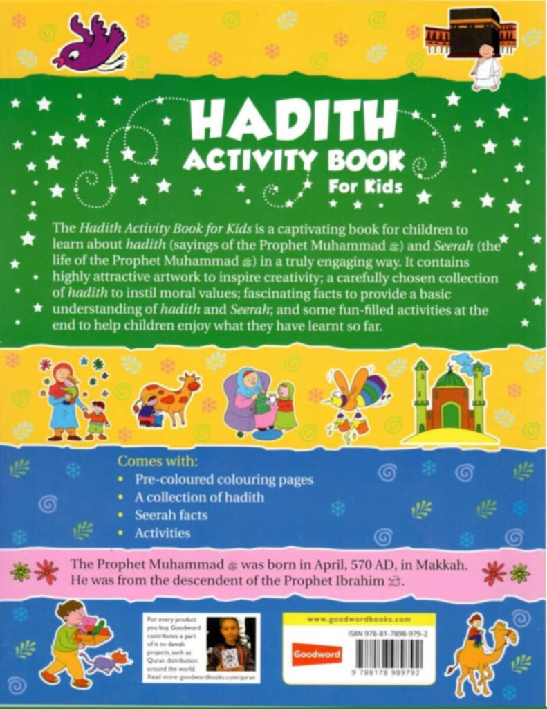 The Hadith Activity Book for Kids is a captivating book for children to learn about hadith (sayings of the Prophet Muhammad) and Seerah (the life of the Prophet Muhammad) in a truly engaging way. It contains highly attractive artwork to inspire creativity; a carefully chosen collection of hadith to instil moral values; fascinating facts to provide a basic understanding of hadith and Seerah; and some fun-filled activities at the end to help children enjoy what they have learnt so far. Comes with: * Pre-coloured colouring pages * A collection of hadith * Seerah facts * Activities.