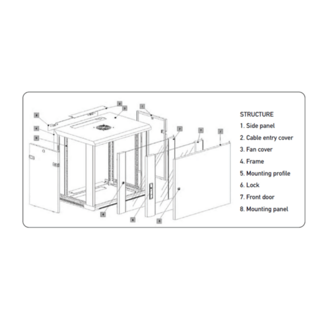 â—† 9U WALL TYPE CABINET W=600mm D=600mm Front glass door with spring Loaded hinge System, Side removable doors, including 1way fan (top panel). Black - Including 6way PDU - Flat pack.