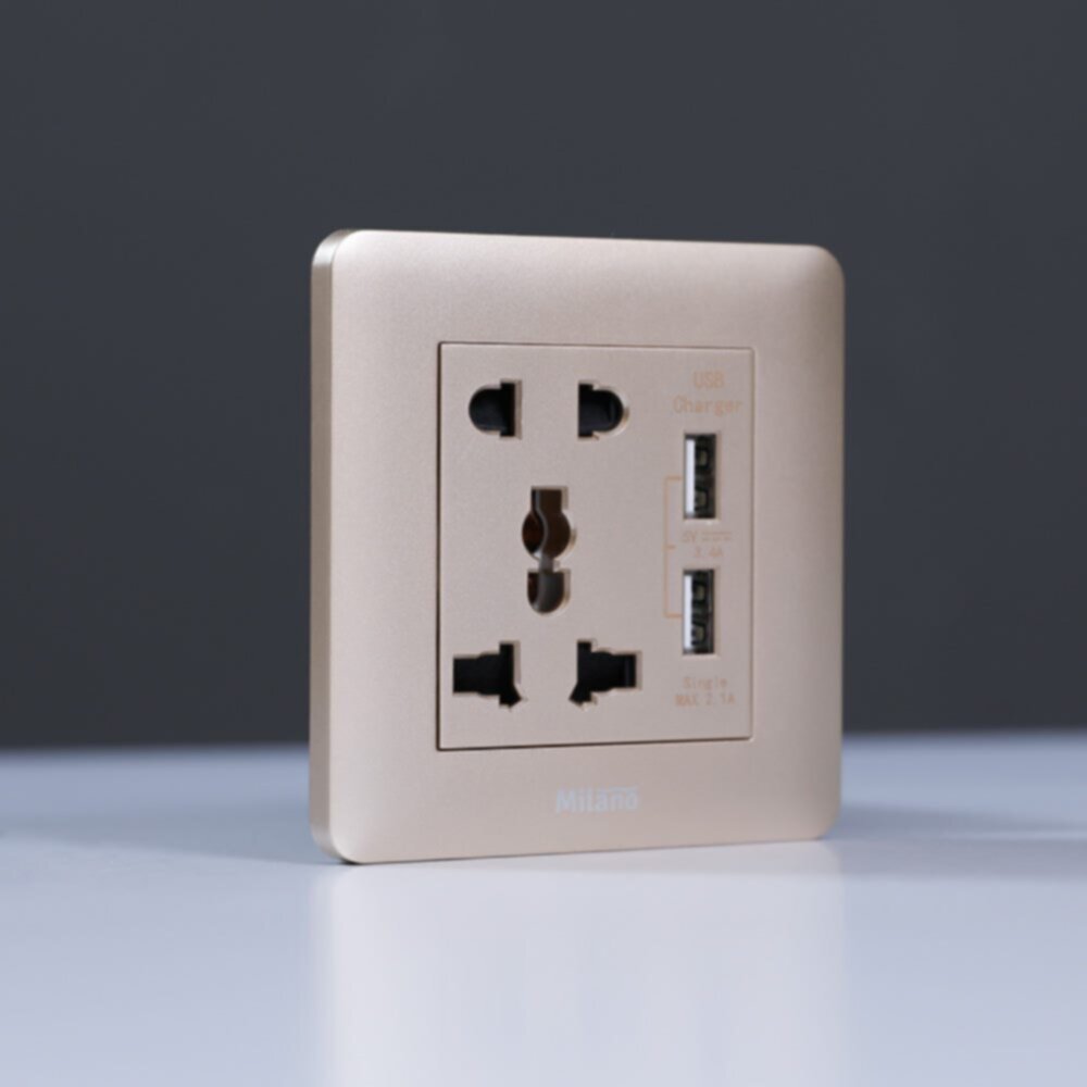 MILANO | 2 Pin & 3 Pin Universal Socket With 2.1A Us-Gold | 210100300349